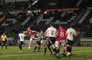 East Stirlingshire took the lead on forty-three minutes. A corner by Ben Lamont is headed down by Ynyr Liddell in the path of Lucas McRoberts whose strike finds the bottom right corner.