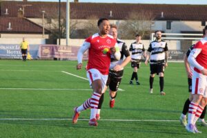 Errol Douglas comes close on thirty-five minutes. Jamie Docherty feeds him in Douglas who attempts to lob Gretna keeper Jim Atkinson, but it isn’t on target and Gretna clear.