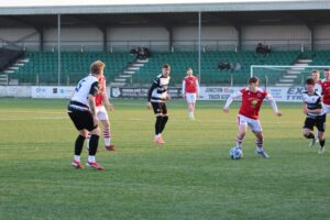 Up the other end, on seven minutes Gretna’s Hayden Tait’s cross from the right is headed down by Kyan Gunn to striker Iain Anderson in Acers of space in the box. Sam Gormley makes a vital challenge for the visitors.
