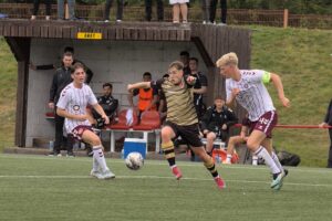 Hearts B took an early lead on thirteen minutes. Kai Smutek sends it long down the right. Mikey Andrews comes of his line and Greg Page doesn’t deal with the ball forward. Connor Dow nips in between them and stabs it home for the opening goal. Broxburn draw level on eighteen minutes. Euan Glasgow fouls Jamie Docherty just outside the box on the left. The free kick, taken by Jamie Docherty creates a scramble in the box, which Hearts only get half clear as far as Errol Douglas whose shot finds the bottom right corner. It was the visitors who regained the lead on thirty-two minutes. Gus Stevenson plays in Euan Glasgow who slots past keeper Andrews, putting the wee Jambos 2-1 up at the half time break.